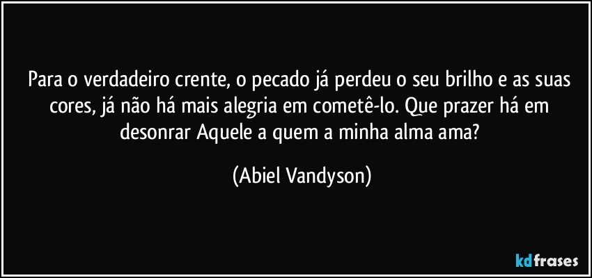 Para o verdadeiro crente, o pecado já perdeu o seu brilho e as suas cores, já não há mais alegria em cometê-lo. Que prazer há em desonrar Aquele a quem a minha alma ama?