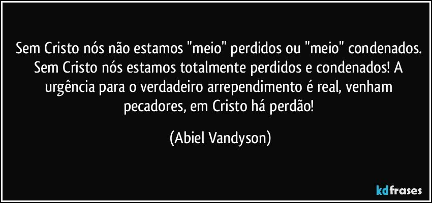 Sem Cristo nós não estamos "meio" perdidos ou "meio" condenados. Sem Cristo nós estamos totalmente perdidos e condenados! A urgência para o verdadeiro arrependimento é real, venham pecadores, em Cristo há perdão!