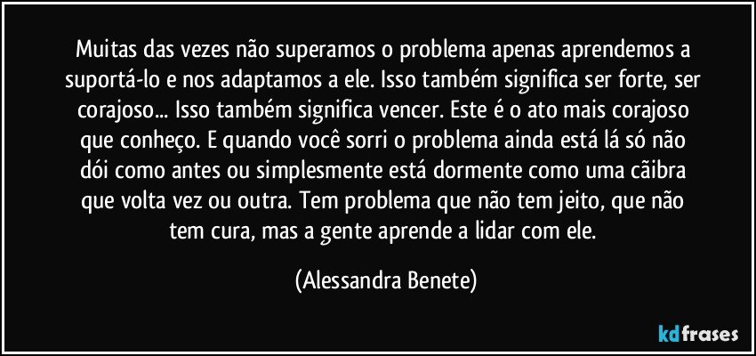 Muitas das vezes não superamos o problema apenas aprendemos a suportá-lo e nos adaptamos a ele. Isso também significa ser forte, ser corajoso... Isso também significa vencer. Este é o ato mais corajoso que conheço. E quando você sorri o problema ainda está lá só não dói como antes ou simplesmente está dormente como uma cãibra que volta vez ou outra. Tem problema que não tem jeito, que não tem cura, mas a gente aprende a lidar com ele.