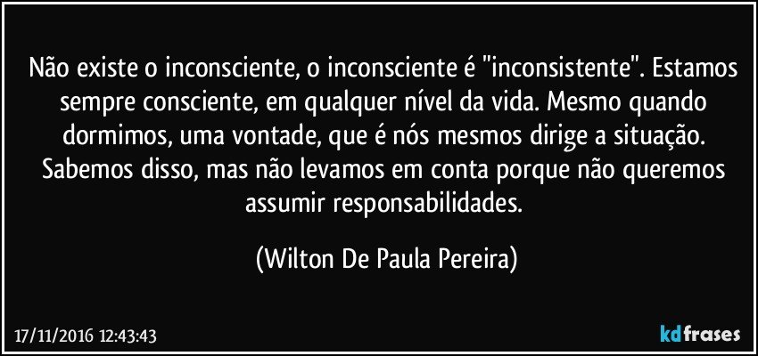 Não existe o inconsciente, o inconsciente é "inconsistente". Estamos sempre consciente, em qualquer nível da vida. Mesmo quando dormimos, uma vontade, que é nós mesmos dirige a situação. Sabemos disso, mas não levamos em conta porque não queremos assumir responsabilidades.