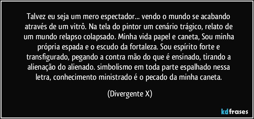 Talvez eu seja um mero espectador... vendo o mundo se acabando através de um vitrô. Na tela do pintor um cenário trágico, relato de um mundo relapso colapsado. Minha vida papel e caneta, Sou minha própria espada e o escudo da fortaleza. Sou espírito forte e transfigurado, pegando a contra mão do que é ensinado, tirando a alienação do alienado. simbolismo em toda parte espalhado nessa letra, conhecimento ministrado é o pecado da minha caneta.