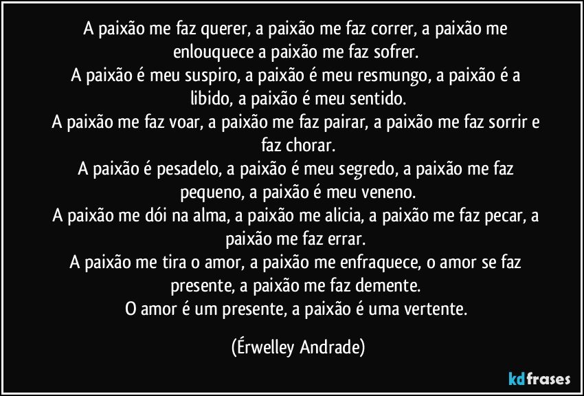 A paixão é pesadelo, a paixão é meu segredo, a paixão me faz pequeno, a paixão é meu veneno.
