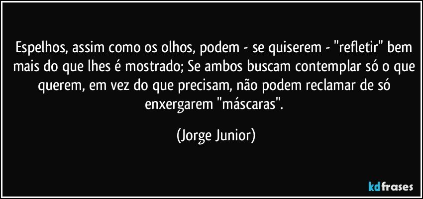 Espelhos, assim como os olhos, podem - se quiserem - "refletir" bem mais do que lhes é mostrado; Se ambos buscam contemplar só o que querem, em vez do que precisam, não podem reclamar de só enxergarem "máscaras.