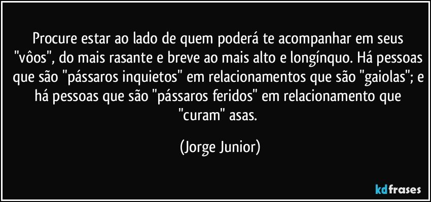 Procure estar ao lado de quem poderá te acompanhar em seus "vôos", do mais rasante e breve ao mais alto e longínquo. Há pessoas que são "pássaros inquietos" em relacionamentos que são "gaiolas"; e há pessoas que são "pássaros feridos" em relacionamento que "curam" asas.