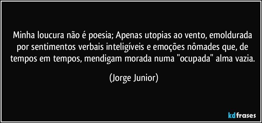 Minha loucura não é poesia; Apenas utopias ao vento, emoldurada por sentimentos verbais inteligíveis e emoções nômades que, de tempos em tempos, mendigam morada numa "ocupada" alma vazia.