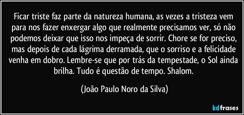 Ficar triste faz parte da natureza humana, as vezes a tristeza vem para nos fazer enxergar algo que realmente precisamos ver, só não podemos deixar que isso nos impeça de sorrir. Chore se for preciso, mas depois de cada lágrima derramada, que o sorriso e a felicidade venha em dobro. Lembre-se que por trás da tempestade, o Sol ainda brilha. Tudo é questão de tempo. Shalom.