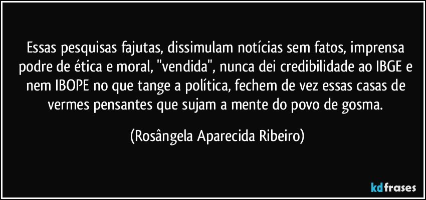 Essas pesquisas fajutas, dissimulam notícias sem fatos, imprensa podre de ética e moral, "vendida", nunca dei credibilidade ao IBGE e nem IBOPE no que tange a política, fechem de vez essas casas de vermes pensantes que sujam a mente do povo de gosma.