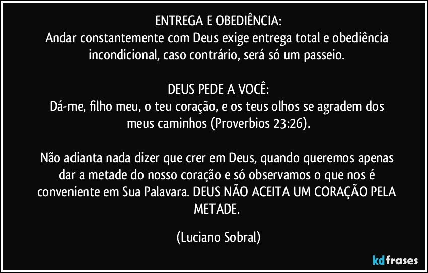 Não adianta nada dizer que crer em Deus, quando queremos apenas dar a metade do nosso coração e só observamos o que nos é conveniente em Sua Palavara. DEUS NÃO ACEITA UM CORAÇÃO PELA METADE.