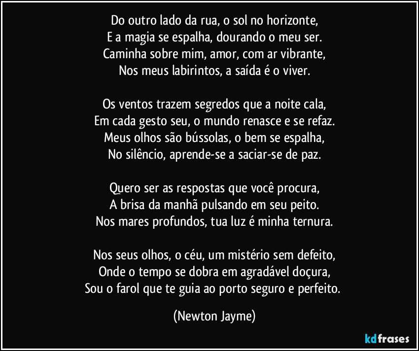 | “ Do outro lado da rua, o sol no horizonte, E a magia se espalha, dourando o meu ser. Caminha sobre mim, amor, com ar vibrante, Nos meus labirintos, a saída é o viver. Os ventos trazem segredos que a noite cala, Em cada gesto seu, o mundo renasce e se refaz. Meus olhos são bússolas, o bem se espalha, No silêncio, aprende-se a saciar-se de paz. Quero ser as respostas que você procura, A brisa da manhã pulsando em seu peito. Nos mares profundos, tua luz é minha ternura. Nos seus olhos, o céu, um mistério sem defeito, Onde o tempo se dobra em agradável doçura, Sou o farol que te guia ao porto seguro e perfeito.” |