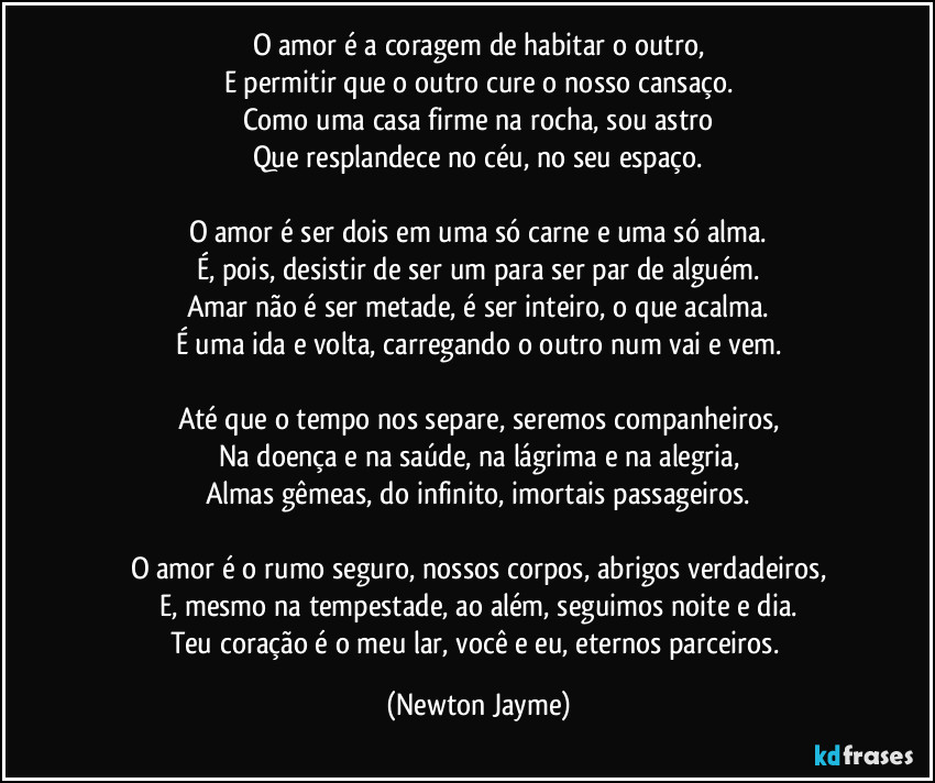 | “ O amor é a coragem de habitar o outro, E permitir que o outro cure o nosso cansaço. Como uma casa firme na rocha, sou astro Que resplandece no céu, no seu espaço. O amor é ser dois em uma só carne e uma só alma. É, pois, desistir de ser um para ser par de alguém. Amar não é ser metade, é ser inteiro, o que acalma. É uma ida e volta, carregando o outro num vai e vem. Até que o tempo nos separe, seremos companheiros, Na doença e na saúde, na lágrima e na alegria, Almas gêmeas, do infinito, imortais passageiros. O amor é o rumo seguro, nossos corpos, abrigos verdadeiros, E, mesmo na tempestade, ao além, seguimos noite e dia. Teu coração é o meu lar, você e eu, eternos parceiros.” |