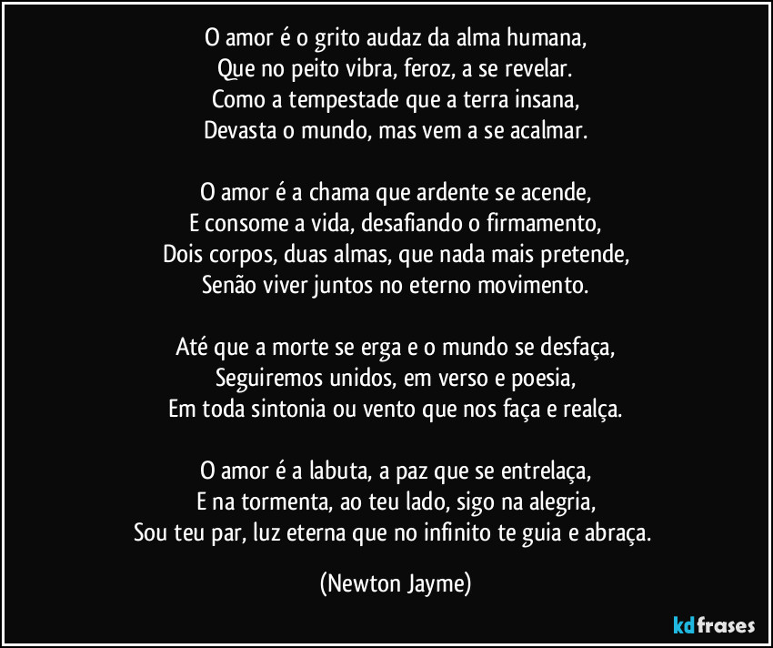 | “ O amor é o grito audaz da alma humana, Que no peito vibra, feroz, a se revelar. Como a tempestade que a terra insana, Devasta o mundo, mas vem a se acalmar. O amor é a chama que ardente se acende, E consome a vida, desafiando o firmamento, Dois corpos, duas almas, que nada mais pretende, Senão viver juntos no eterno movimento. Até que a morte se erga e o mundo se desfaça, Seguiremos unidos, em verso e poesia, Em toda sintonia ou vento que nos faça e realça. O amor é a labuta, a paz que se entrelaça, E na tormenta, ao teu lado, sigo na alegria, Sou teu par, luz eterna que no infinito te guia e abraça.” |
