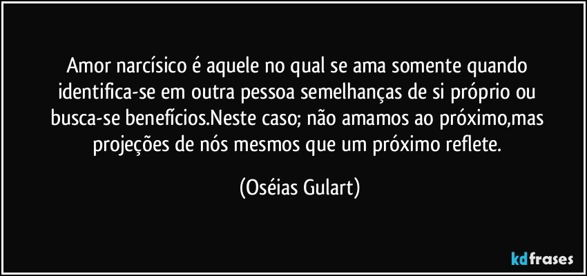 Amor narcísico é aquele no qual se ama somente quando identifica-se em outra pessoa semelhanças de si próprio ou busca-se benefícios.Neste caso; não amamos ao próximo,mas projeções de nós mesmos que um próximo reflete.