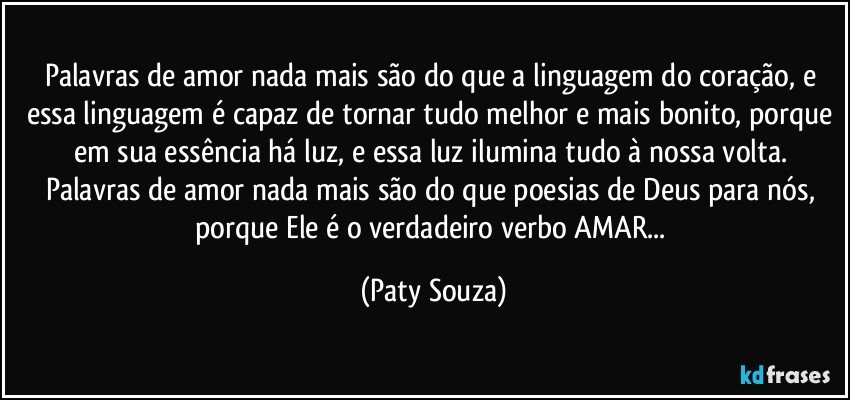 Palavras de amor nada mais são do que a linguagem do coração, e essa linguagem é capaz de tornar tudo melhor e mais bonito, porque em sua essência há luz, e essa luz ilumina tudo à nossa volta. Palavras de amor nada mais são do que poesias de Deus para nós, porque Ele é o verdadeiro verbo AMAR...