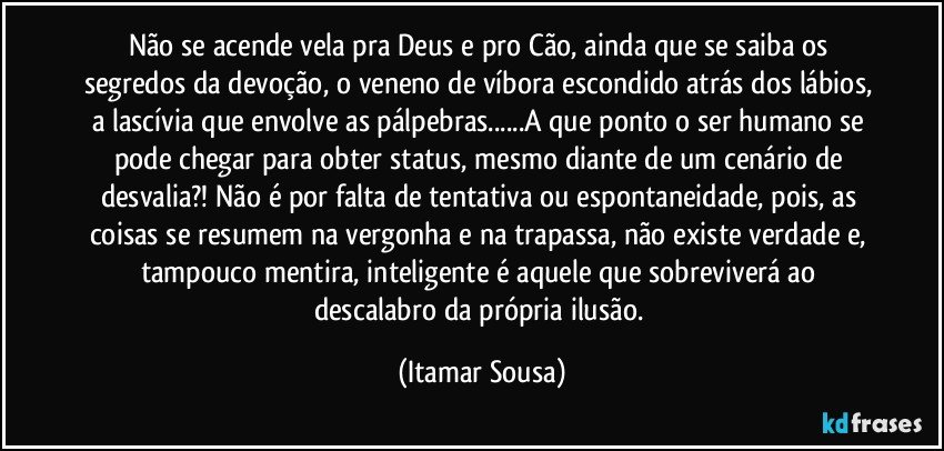 Não se acende vela pra Deus e pro Cão, ainda que se saiba os segredos da devoção, o veneno de víbora escondido atrás dos lábios, a lascívia que envolve as pálpebras...A que ponto o ser humano se pode chegar para obter status, mesmo diante de um cenário de desvalia?! Não é por falta de tentativa ou espontaneidade, pois, as coisas se resumem na vergonha e na trapassa, não existe verdade e, tampouco mentira, inteligente é aquele que sobreviverá ao descalabro da própria ilusão.