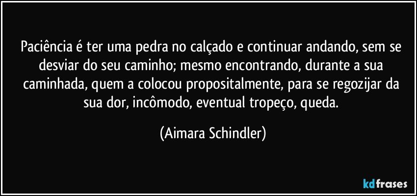 Paciência é ter uma pedra no calçado e continuar andando, sem se desviar do seu caminho;  mesmo encontrando, durante a sua caminhada, quem a  colocou propositalmente, para se regozijar da sua dor, incômodo, eventual tropeço, queda. (Aimara Schindler)