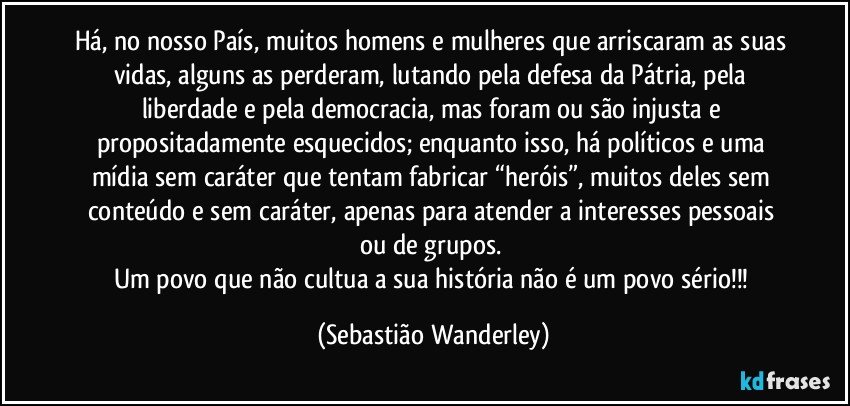 Há, no nosso País, muitos homens e mulheres que arriscaram as suas vidas, alguns as perderam, lutando pela defesa da Pátria, pela liberdade e pela democracia, mas foram ou são injusta e propositadamente esquecidos; enquanto isso, há políticos e uma mídia sem caráter que tentam fabricar “heróis”, muitos deles sem conteúdo e sem caráter, apenas para atender a interesses pessoais ou de grupos.