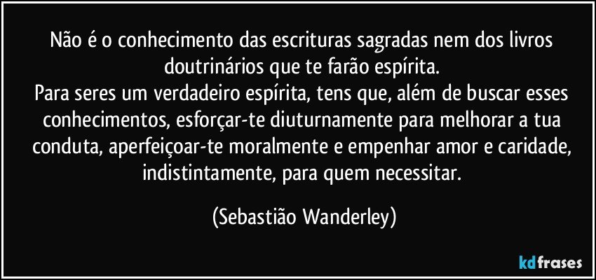 Para seres um verdadeiro espírita, tens que, além de buscar esses conhecimentos, esforçar-te diuturnamente para melhorar a tua conduta, aperfeiçoar-te moralmente e empenhar amor e caridade, indistintamente, para quem necessitar. (Sebastião Wanderley)