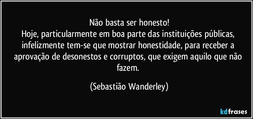Hoje, particularmente em boa parte das instituições públicas, infelizmente tem-se que mostrar honestidade, para receber a aprovação de desonestos e corruptos, que exigem aquilo que não fazem. (Sebastião Wanderley)