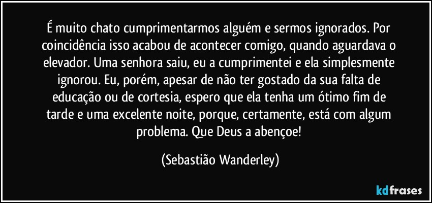 É muito chato cumprimentarmos alguém e sermos ignorados. Por coincidência isso acabou de acontecer comigo, quando aguardava o elevador. Uma senhora saiu, eu a cumprimentei e ela simplesmente ignorou. Eu, porém, apesar de não ter gostado da sua falta de educação ou de cortesia, espero que ela tenha um ótimo fim de tarde e uma excelente noite, porque, certamente, está com algum problema. Que Deus a abençoe! (Sebastião Wanderley)