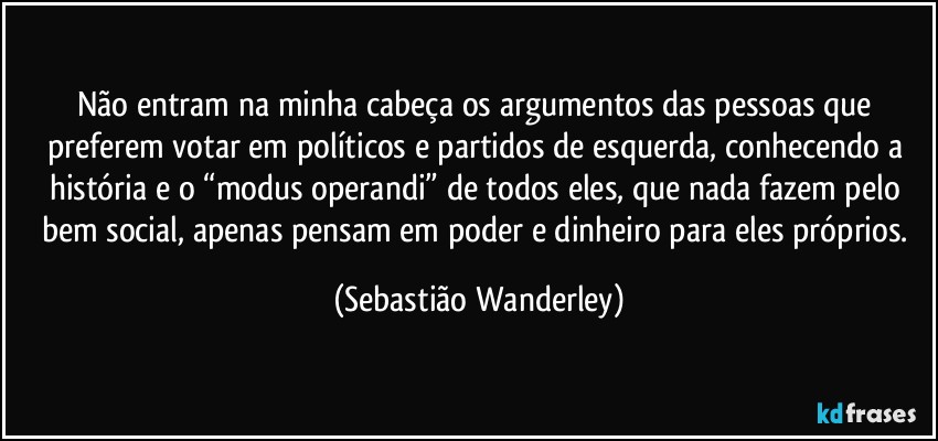 Não entram na minha cabeça os argumentos das pessoas que preferem votar em políticos e partidos de esquerda, conhecendo a história e o “modus operandi” de todos eles, que nada fazem pelo bem social, apenas pensam em poder e dinheiro para eles próprios. (Sebastião Wanderley)