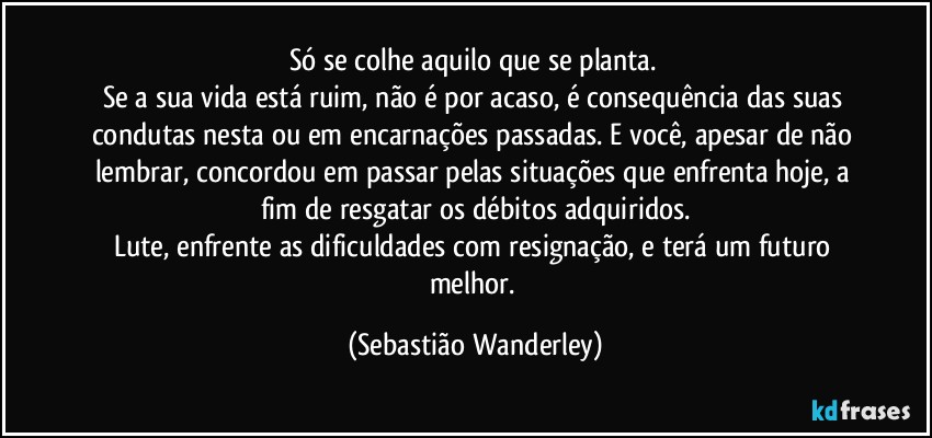 Se a sua vida está ruim, não é por acaso, é consequência das suas condutas nesta ou em encarnações passadas. E você, apesar de não lembrar, concordou em passar pelas situações que enfrenta hoje, a fim de resgatar os débitos adquiridos.