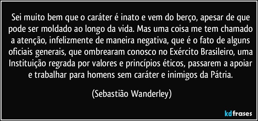 Sei muito bem que o caráter é inato e vem do berço, apesar de que pode ser moldado ao longo da vida. Mas uma coisa me tem chamado a atenção, infelizmente de maneira negativa, que é o fato de alguns oficiais generais, que ombrearam conosco no Exército Brasileiro, uma Instituição regrada por valores e princípios éticos, passarem a apoiar e trabalhar para homens sem caráter e inimigos da Pátria. (Sebastião Wanderley)