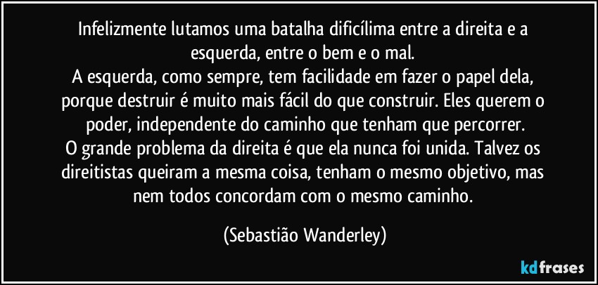 O grande problema da direita é que ela nunca foi unida. Talvez os direitistas queiram a mesma coisa, tenham o mesmo objetivo, mas nem todos concordam com o mesmo caminho. (Sebastião Wanderley)