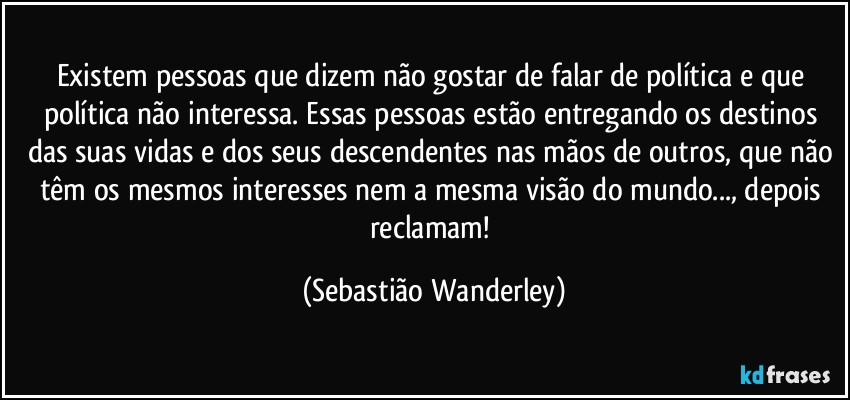 Existem pessoas que dizem não gostar de falar de política e que política não interessa. Essas pessoas estão entregando os destinos das suas vidas e dos seus descendentes nas mãos de outros, que não têm os mesmos interesses nem a mesma visão do mundo..., depois reclamam! (Sebastião Wanderley)