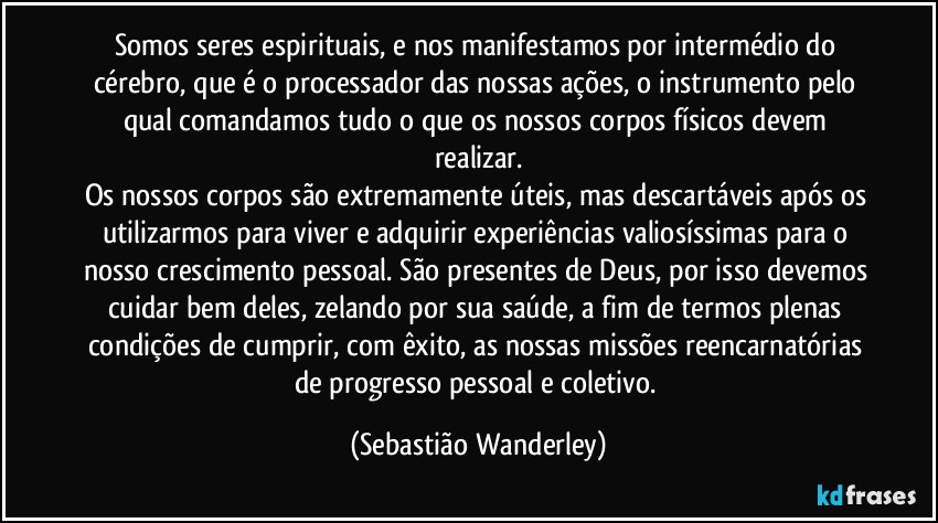 Os nossos corpos são extremamente úteis, mas descartáveis após os utilizarmos para viver e adquirir experiências valiosíssimas para o nosso crescimento pessoal. São presentes de Deus, por isso devemos cuidar bem deles, zelando por sua saúde, a fim de termos plenas condições de cumprir, com êxito, as nossas missões reencarnatórias de progresso pessoal e coletivo. (Sebastião Wanderley)