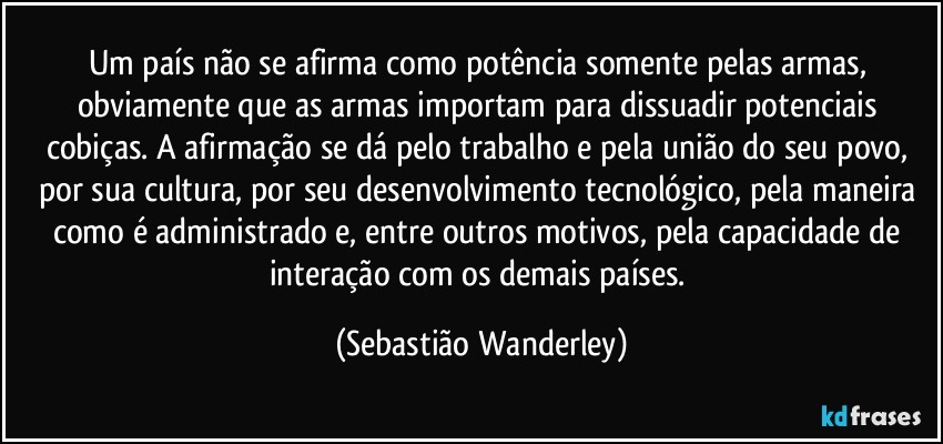 Um país não se afirma como potência somente pelas armas, obviamente que as armas importam para dissuadir potenciais cobiças. A afirmação se dá pelo trabalho e pela união do seu povo, por sua cultura, por seu desenvolvimento tecnológico, pela maneira como é administrado e, entre outros motivos, pela capacidade de interação com os demais países. (Sebastião Wanderley)