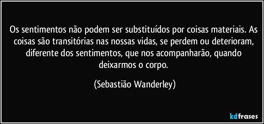 Os sentimentos não podem ser substituídos por coisas materiais. As coisas são transitórias nas nossas vidas, se perdem ou deterioram, diferente dos sentimentos, que nos acompanharão, quando deixarmos o corpo. (Sebastião Wanderley)