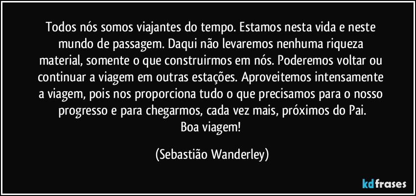 Todos nós somos viajantes do tempo. Estamos nesta vida e neste mundo de passagem. Daqui não levaremos nenhuma riqueza material, somente o que construirmos em nós. Poderemos voltar ou continuar a viagem em outras estações. Aproveitemos intensamente a viagem, pois nos proporciona tudo o que precisamos para o nosso progresso e para chegarmos, cada vez mais, próximos do Pai.
