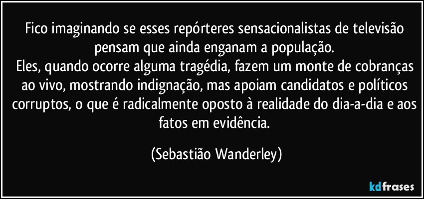 Eles, quando ocorre alguma tragédia, fazem um monte de cobranças ao vivo, mostrando indignação, mas apoiam candidatos e políticos corruptos, o que é radicalmente oposto à realidade do dia-a-dia e aos fatos em evidência. (Sebastião Wanderley)