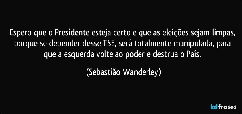 Espero que o Presidente esteja certo e que as eleições sejam limpas, porque se depender desse TSE, será totalmente manipulada, para que a esquerda volte ao poder e destrua o País. (Sebastião Wanderley)