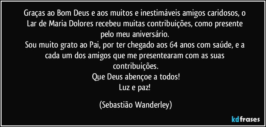 Graças ao Bom Deus e aos muitos e inestimáveis amigos caridosos, o Lar de Maria Dolores recebeu muitas contribuições, como presente pelo meu aniversário.