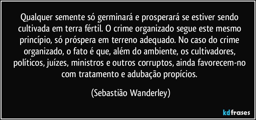 Qualquer semente só germinará e prosperará se estiver sendo cultivada em terra fértil. O crime organizado segue este mesmo princípio, só próspera em terreno adequado. No caso do crime organizado, o fato é que, além do ambiente, os cultivadores, políticos, juízes, ministros e outros corruptos, ainda favorecem-no com tratamento e adubação propícios. (Sebastião Wanderley)