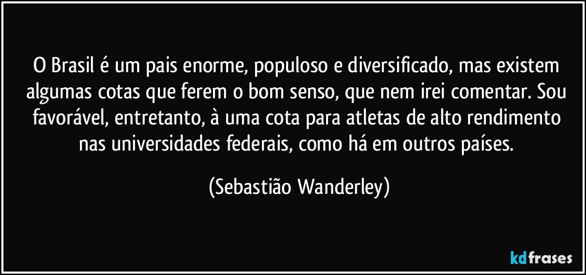 O Brasil é um pais enorme, populoso e diversificado, mas existem algumas cotas que ferem o bom senso, que nem irei comentar. Sou favorável, entretanto, à uma cota para atletas de alto rendimento nas universidades federais, como há em outros países. (Sebastião Wanderley)