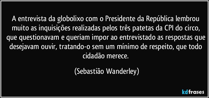 A entrevista da globolixo com o Presidente da República lembrou muito as inquisições realizadas pelos três patetas da CPI do circo, que questionavam e queriam impor ao entrevistado as respostas que desejavam ouvir, tratando-o sem um mínimo de respeito, que todo cidadão merece. (Sebastião Wanderley)