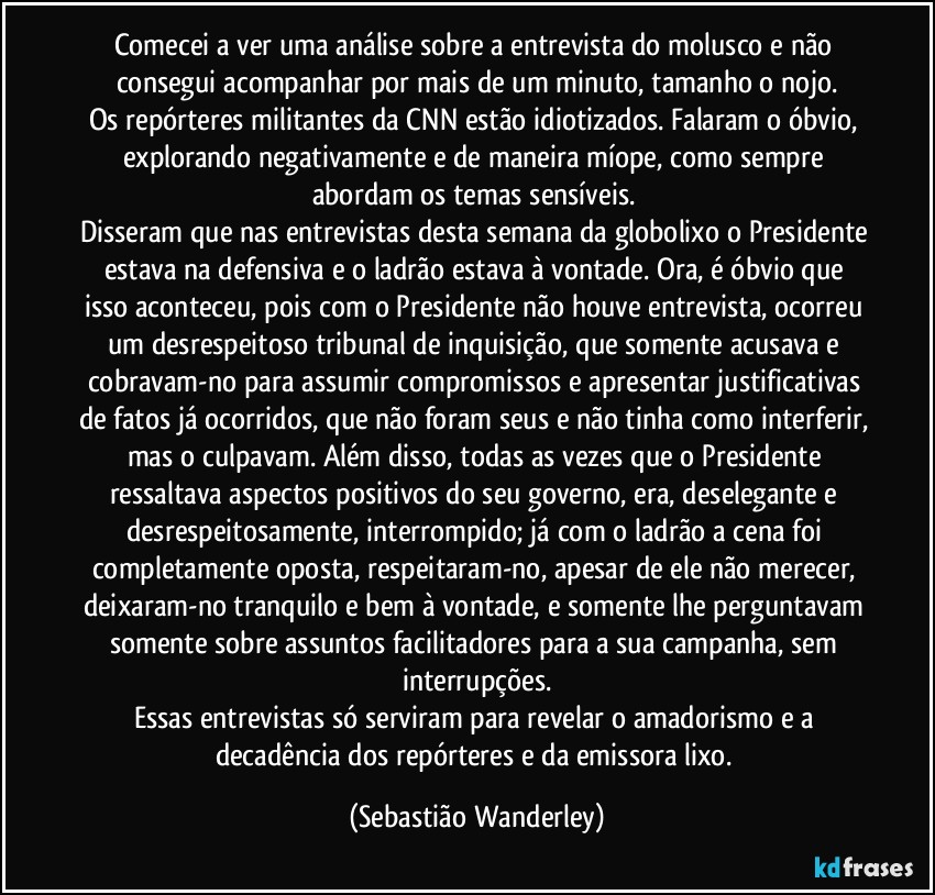 Disseram que nas entrevistas desta semana da globolixo o Presidente estava na defensiva e o ladrão estava à vontade. Ora, é óbvio que isso aconteceu, pois com o Presidente não houve entrevista, ocorreu um desrespeitoso tribunal de inquisição, que somente acusava e cobravam-no para assumir compromissos e apresentar justificativas de fatos já ocorridos, que não foram seus e não tinha como interferir, mas o culpavam. Além disso, todas as vezes que o Presidente ressaltava aspectos positivos do seu governo, era, deselegante e desrespeitosamente, interrompido; já com o ladrão a cena foi completamente oposta, respeitaram-no, apesar de ele não merecer, deixaram-no tranquilo e bem à vontade, e somente lhe perguntavam somente sobre assuntos facilitadores para a sua campanha, sem interrupções.