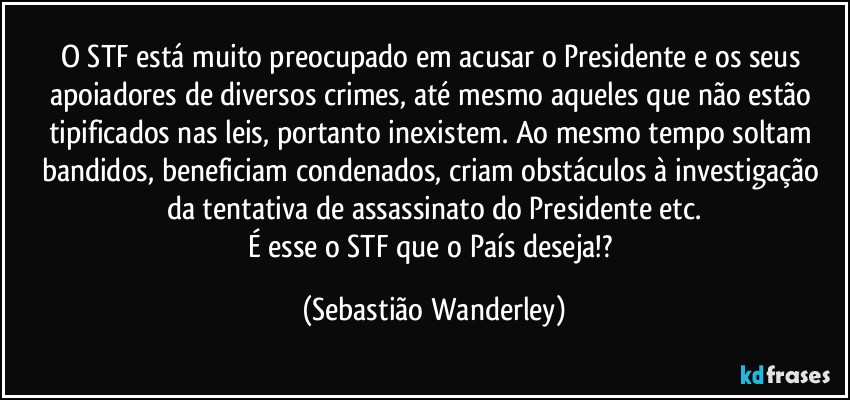 O STF está muito preocupado em acusar o Presidente e os seus apoiadores de diversos crimes, até mesmo aqueles que não estão tipificados nas leis, portanto inexistem. Ao mesmo tempo soltam bandidos, beneficiam condenados, criam obstáculos à investigação da tentativa de assassinato do Presidente etc.