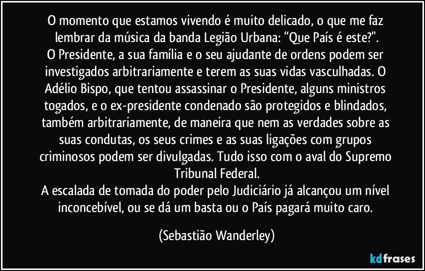 O momento que estamos vivendo é muito delicado, o que me faz lembrar da música da banda Legião Urbana: “Que País é este?".