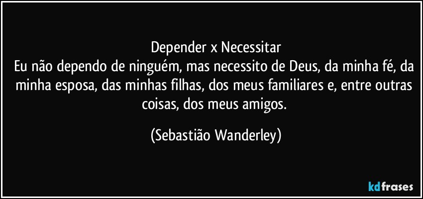Eu não dependo de ninguém, mas necessito de Deus, da minha fé, da minha esposa, das minhas filhas, dos meus familiares e, entre outras coisas, dos meus amigos. (Sebastião Wanderley)