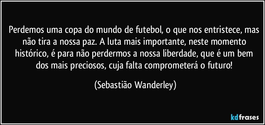 Perdemos uma copa do mundo de futebol, o que nos entristece, mas não tira a nossa paz. A luta mais importante, neste momento histórico, é para não perdermos a nossa liberdade, que é um bem dos mais preciosos, cuja falta comprometerá o futuro! (Sebastião Wanderley)
