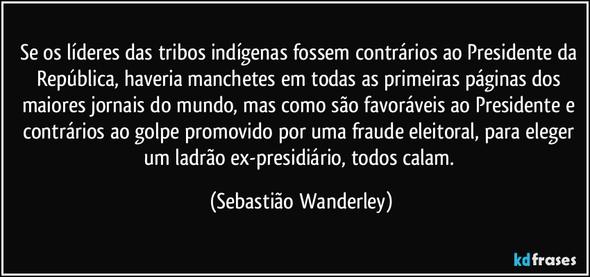 Se os líderes das tribos indígenas fossem contrários ao Presidente da República, haveria manchetes em todas as primeiras páginas dos maiores jornais do mundo, mas como são favoráveis ao Presidente e contrários ao golpe promovido por uma fraude eleitoral, para eleger um ladrão ex-presidiário, todos calam. (Sebastião Wanderley)