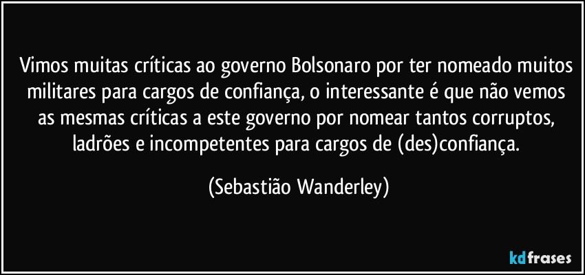 Vimos muitas críticas ao governo Bolsonaro por ter nomeado muitos militares para cargos de confiança, o interessante é que não vemos as mesmas críticas a este governo por nomear tantos corruptos, ladrões e incompetentes para cargos de (des)confiança. (Sebastião Wanderley)