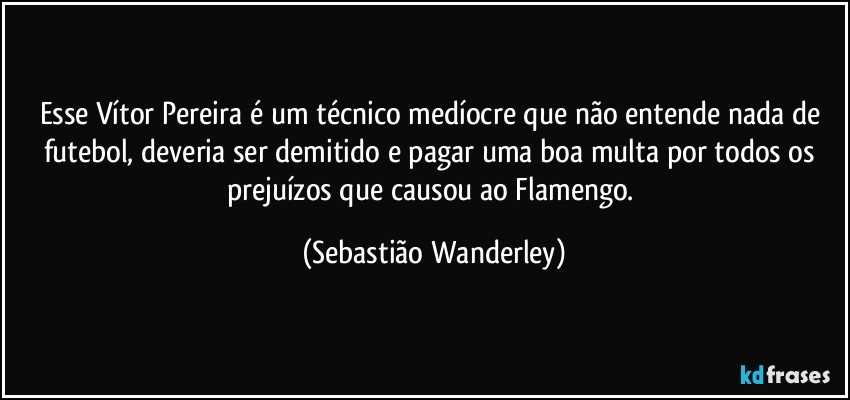 Esse Vítor Pereira é um técnico medíocre que não entende nada de futebol, deveria ser demitido e pagar uma boa multa por todos os prejuízos que causou ao Flamengo. (Sebastião Wanderley)