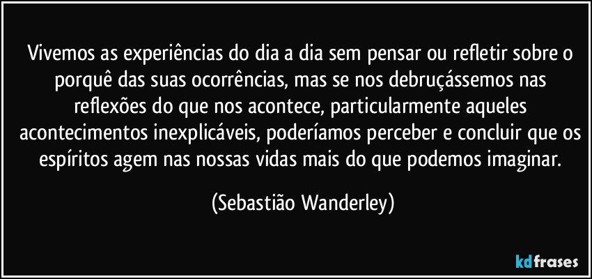 Vivemos as experiências do dia a dia sem pensar ou refletir sobre o porquê das suas ocorrências, mas se nos debruçássemos nas reflexões do que nos acontece, particularmente aqueles acontecimentos inexplicáveis, poderíamos perceber e concluir que os espíritos agem nas nossas vidas mais do que podemos imaginar. (Sebastião Wanderley)