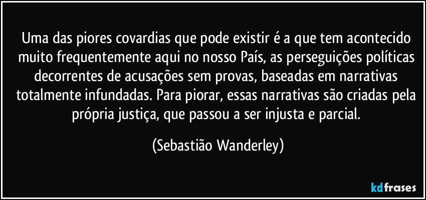 Uma das piores covardias que pode existir é a que tem acontecido muito frequentemente aqui no nosso País, as perseguições políticas decorrentes de acusações sem provas, baseadas em narrativas totalmente infundadas. Para piorar, essas narrativas são criadas pela própria justiça, que passou a ser injusta e parcial. (Sebastião Wanderley)
