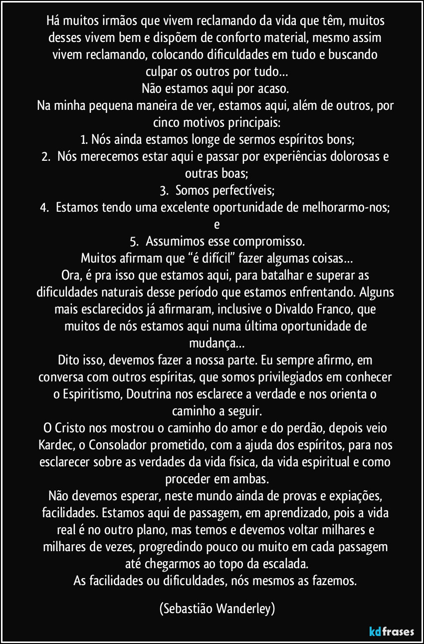 Ora, é pra isso que estamos aqui, para batalhar e superar as dificuldades naturais desse período que estamos enfrentando. Alguns mais esclarecidos já afirmaram, inclusive o Divaldo Franco, que muitos de nós estamos aqui numa última oportunidade de mudança…