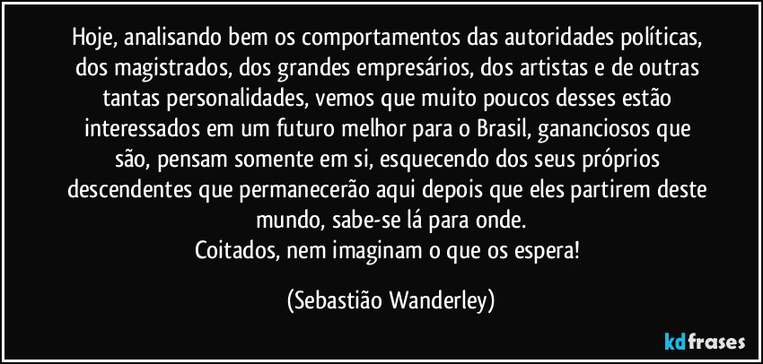 Hoje, analisando bem os comportamentos das autoridades políticas, dos magistrados, dos grandes empresários, dos artistas e de outras tantas personalidades, vemos que muito poucos desses estão interessados em um futuro melhor para o Brasil, gananciosos que são, pensam somente em si, esquecendo dos seus próprios descendentes que permanecerão aqui depois que eles partirem deste mundo, sabe-se lá para onde.